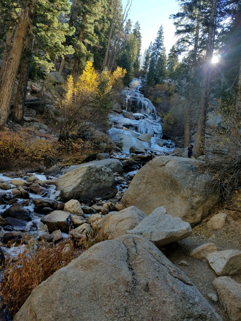 Later on Friday we took a drive to the trailhead for Mt. Whitney, don’t get any wild ideas here, we had no plans to hike up Mt. Whitney! There is a beautiful waterfall just past the set in point. We walked up to it and the most amazing thing was that there was ice and snow! The waterfall was simply gorgeous and at 3:00 in the afternoon we needed jackets because it was 50 degrees. We talked to the old guy who runs the small store and he told us they are usually closed for the season by now because they would normally have 3 feet of snow already!