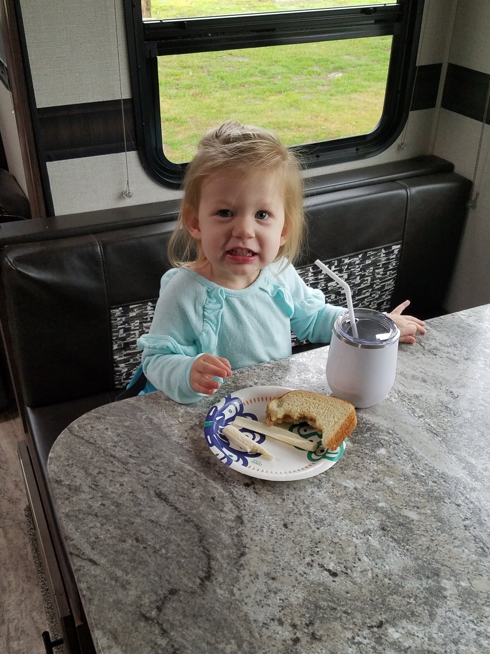Nap time keeps us out of the trailer as her pack and play is in the kitchen. Friday we learned that means no lunch until Peyton wakes up…Saturday we learned our lesson and brought everything out first and cooked outside while she slept.