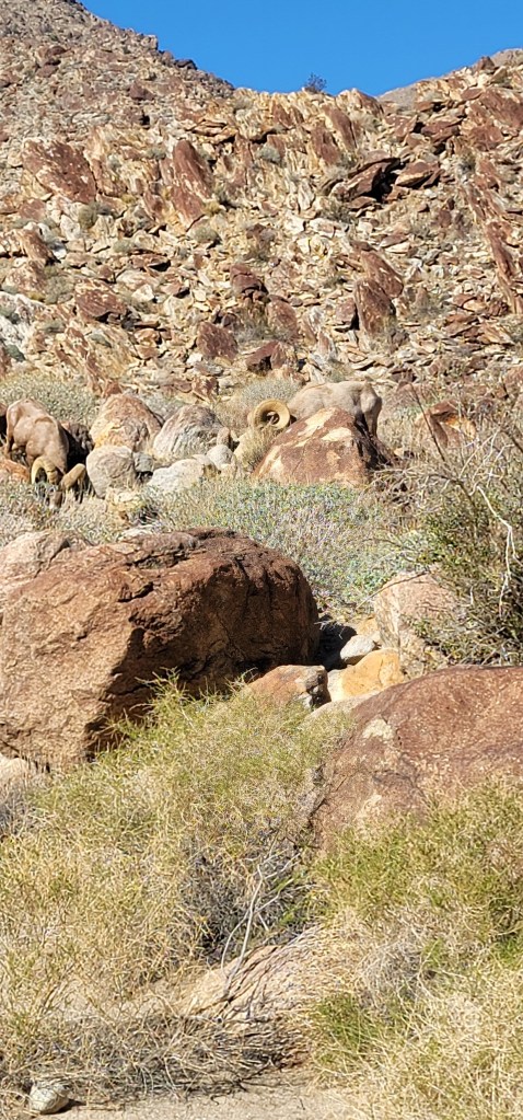 Thursday was amazing! We decided to take the hike that runs from the campground to an oasis up in the hills. The hike was not too strenuous, with only a little climbing over rocks, which is not my strong point, but with Tom’s help I’m improving. The most amazing thing about the hike were the bighorn sheep grazing right by the path. They were so close, when I went around a curve I could have reached out and touched one of them. I have never been so close to a wild animal that wasn’t in a zoo. Do I sound like a complete city girl? Well, I am! The oasis was amazing with rushing water in the middle of the desert. We were not able to get all the way to it because the trail was closed due to some vandalism, apparently someone set fire to some of the palm trees! It was amazingly cooler at the oasis then on the bottom part of the hike and the sound of the rushing water was beautiful.