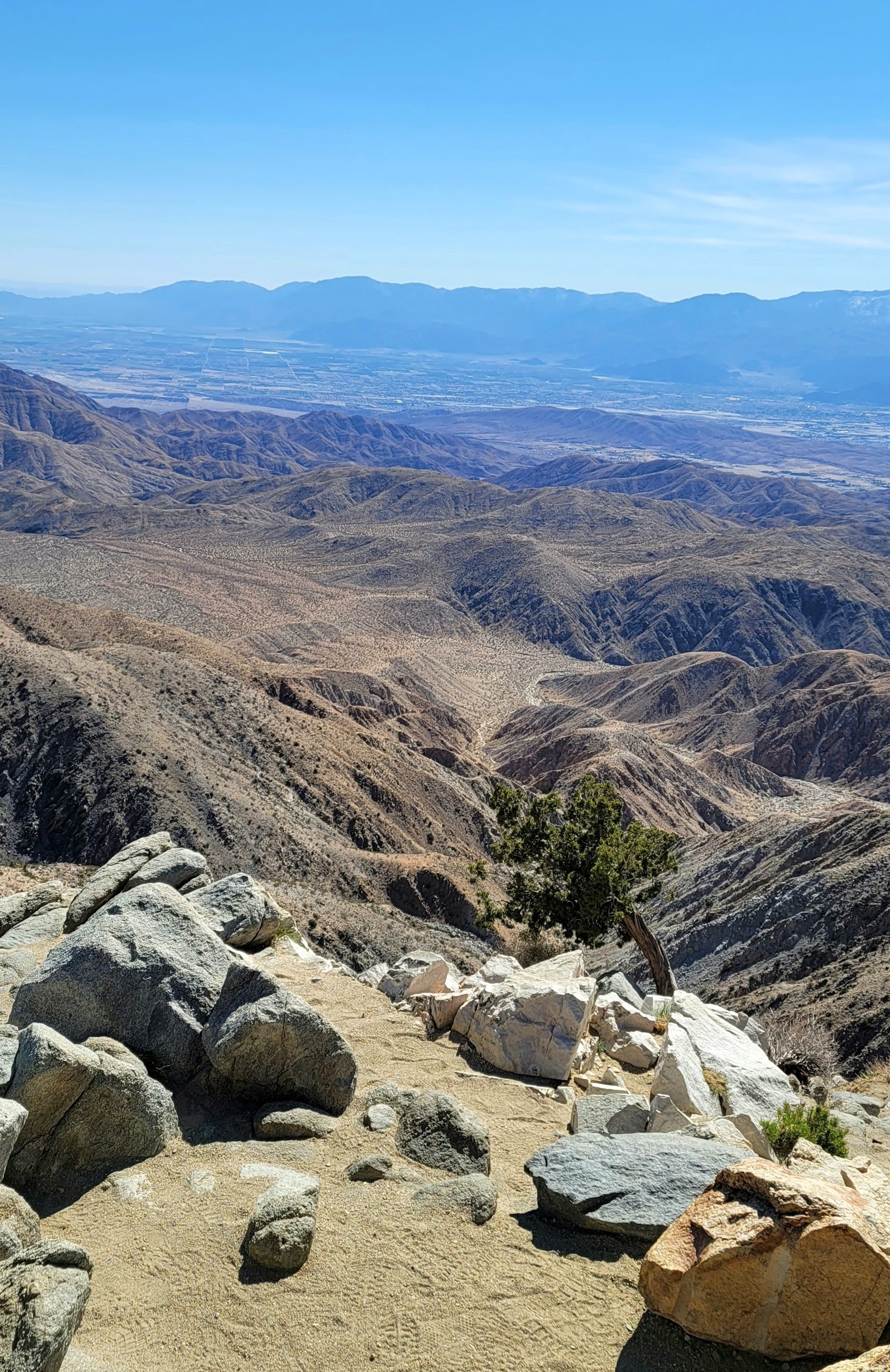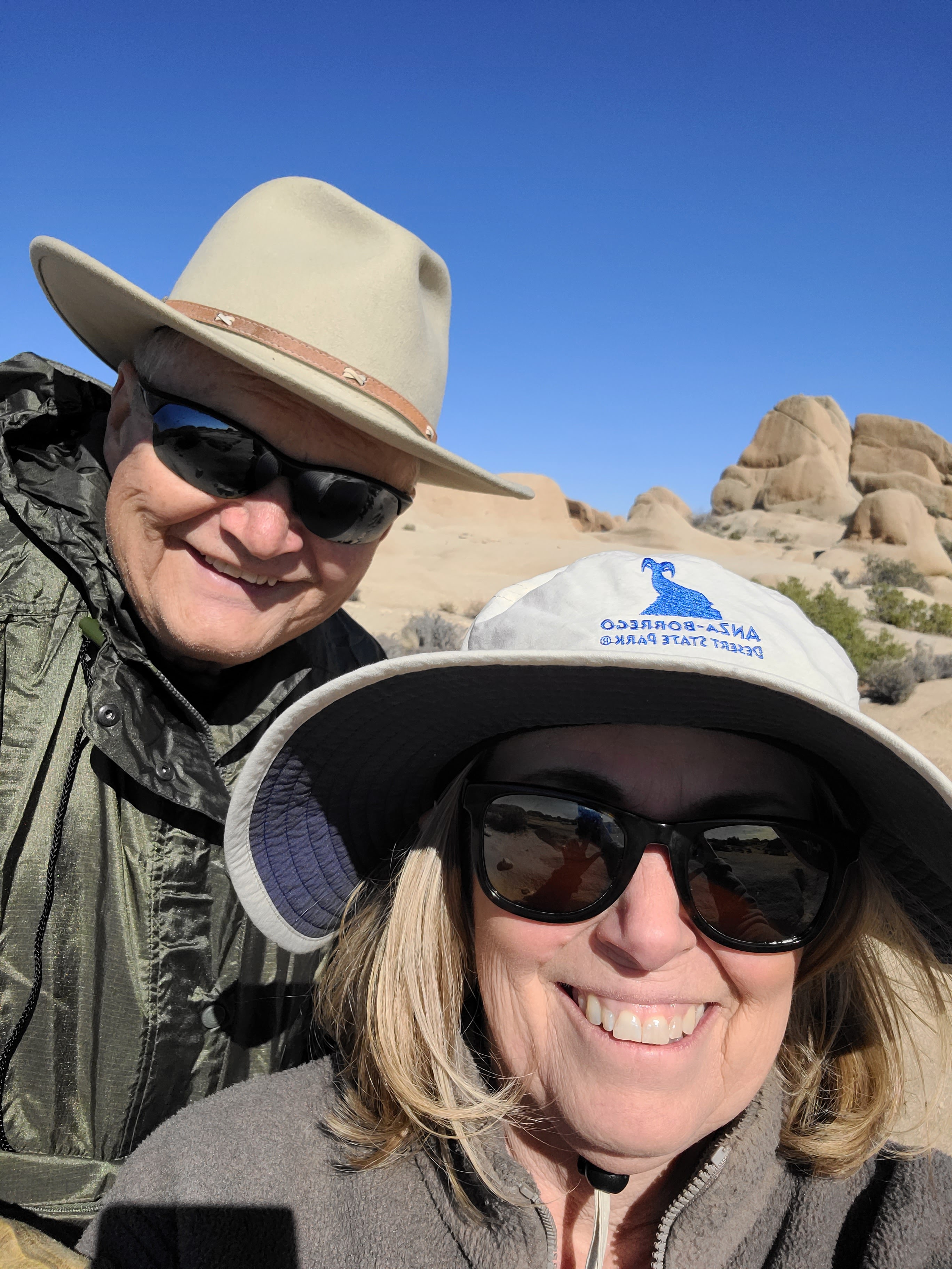 We left home on Thursday, February 24th and headed to Joshua Tree Lake. The weather was not ideal, cold and windy on Wednesday and still quite chilly on Thursday when we arrived. The high temperature that day was 50 degrees and it dipped down into the 30s at night. When we were in the sun it was pleasant enough with a jacket on, but in the shade it was pretty cold. Nonetheless, we were out for an adventure, so we put on warm clothing and had a great time. We recently learned that we could use an electric heater in the main portion of the trailer and keep us warm at night. Since it doesn’t use propane, we save on that as well!