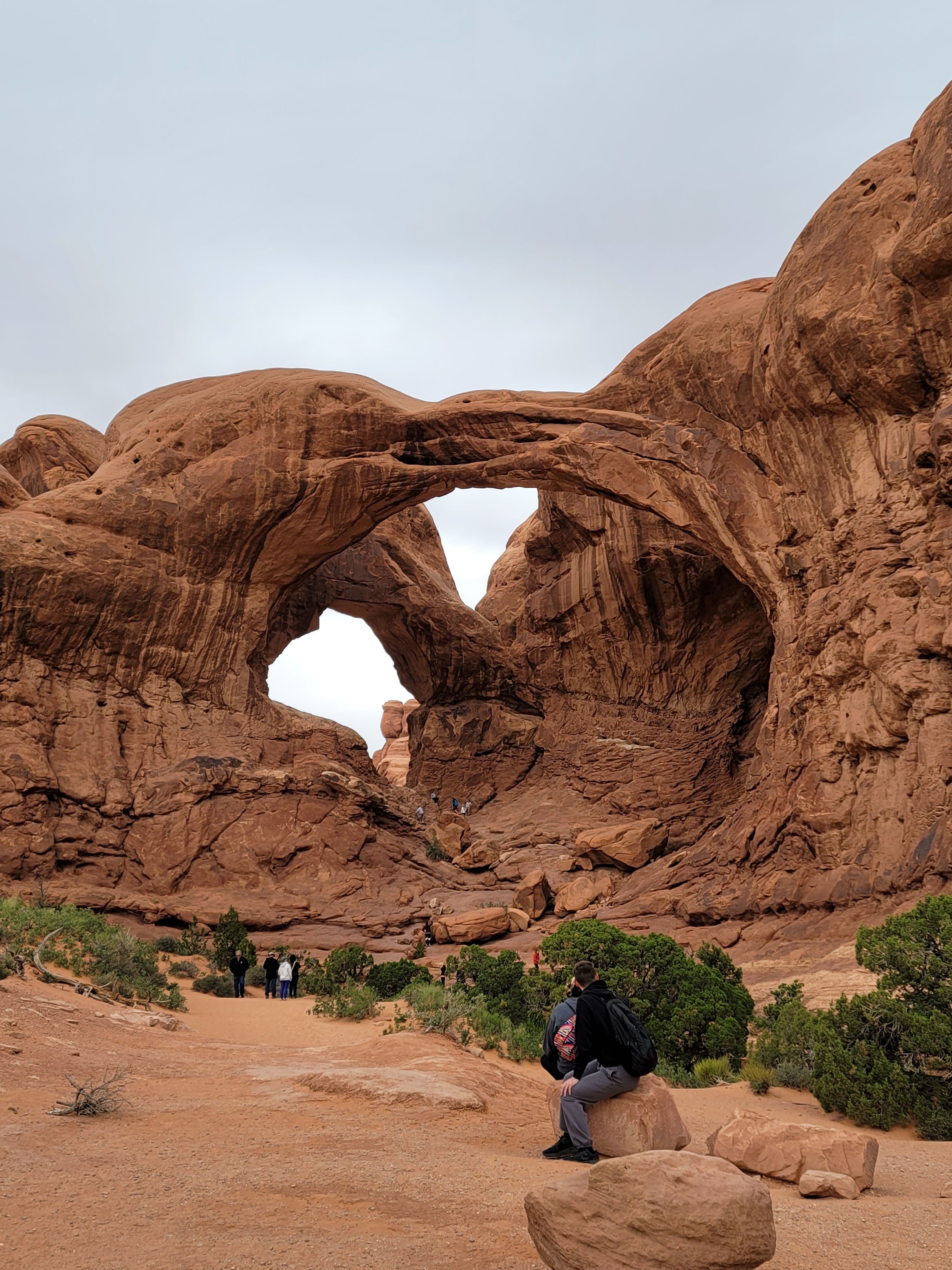 On Thursday morning, we left for Thompson Springs, which is about 30 minutes from The Arches National Park. The 80-degree weather turned to 60 degrees and the wind gusts were around 60 mph! Wow, that was a short-lived summer! Once we were settled at the campsite, I looked into going to the Arches and realized I needed reservations! They have a system of timed entry, and you need a reservation for a certain time in order to get in. The good news is that at 6:00 p.m. each evening times are released for the following day for those people who didn’t get reservations 3 months in advance! I already had the Recreation.gov app so at 6:00 I signed on and there were plenty of reservations available. We got a reservation for 8:00 a.m. on Friday.