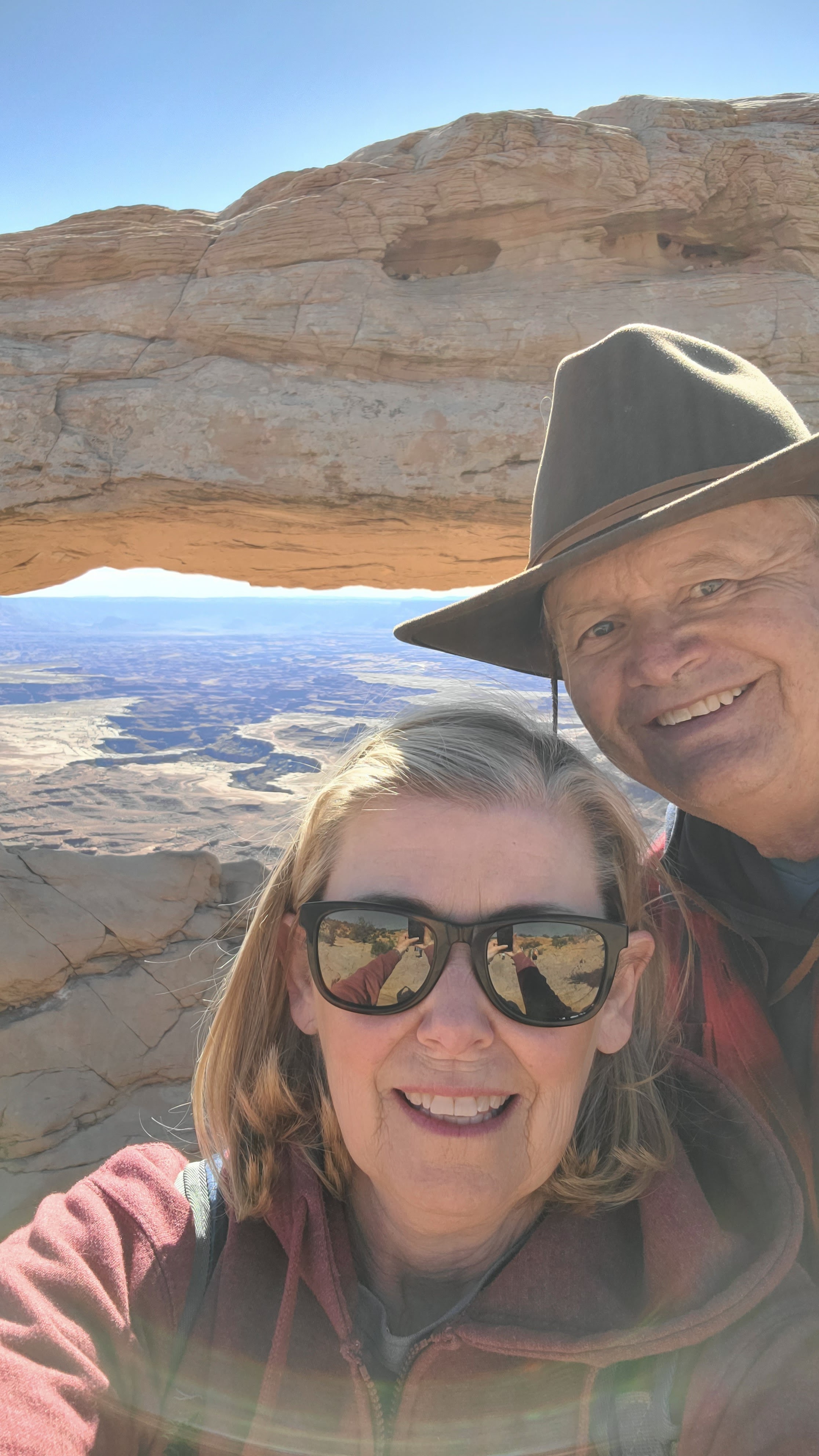 Following our own advice, we got up early and arrived at the park around 8:30 a.m. There was no line so getting in was not a problem. The National Park is sort of a mini Grand Canyon, plus had an arch that we hiked to. Today was brilliant sunshine with bright blue skies but still cold. An interesting thing about this national park is that there are 3 sections which are not connected internally. You need to decide which part you are going to visit. Since “Islands in the Sky” was the closest entry point for us, that is where we went. We packed food and water as there are plenty of places to hike. What we did find out is that although there are many hiking spots, there are very few parking spots. After making the short hike to Mesa Arch and spending some time taking photos and talking to fellow hikers, we went in search of a longer hike. The one we were interested in, Murphy Point, had a full parking lot so we decided on Grand View Point which took us along the ridge of the canyon to a lookout point about 1 mile in. The views were stunning, and the hike was good, not too much climbing over rocks, which is not my favorite part of hiking as we all know what my balance is like!