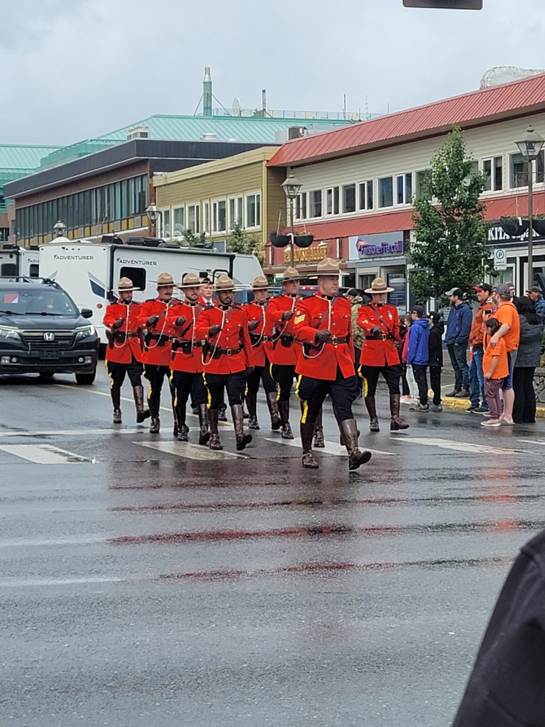 July 1 is Canada Day, and we went to the annual Canada Day parade in downtown Whitehorse. It was rainy and cold, but the parade went on and the parade route was lined with people. I would compare it to a local, hometown parade with more of a multicultural flavor. After the parade we walked to Shipyard Park and watched the raising of the Canadian Flag and “O Canada” sung in three different languages, English, Navajo and French, their three official languages.