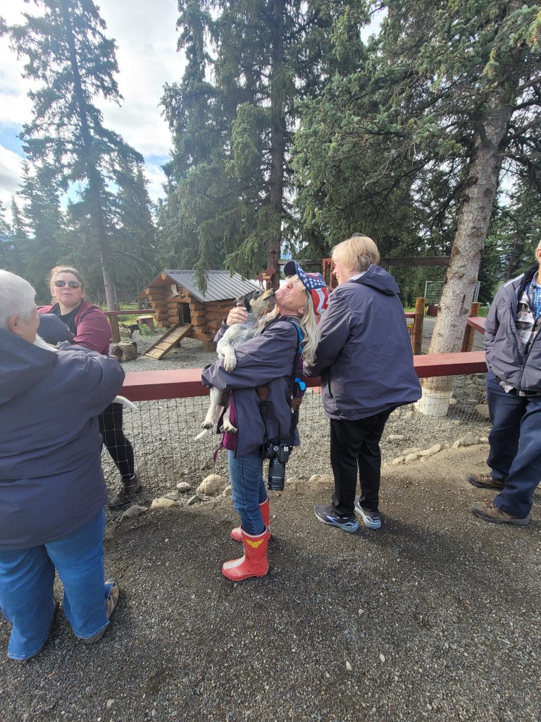Alaska’s state sport is dog mushing and Anchorage to Nome is the route of the yearly Iditarod race. Jeff King is a musher who has entered the race over 30 times and won the race four times. Now, at 67 years old he still enters the race, but also mentors young mushers and runs Husky Homestead where he trains sled dogs. He is funny, entertaining, and knowledgeable, speaking to us for over 45 minutes. He loves Alaska and loves dog mushing. A young woman by the name of Amanda Otto is an up-and-coming musher, and she was there as well speaking about the dogs and how the one thing in common all sled dogs have is a love of running! When they hooked up six dogs, the rest in the of the dogs went wild barking as though they were saying “pick me! Pick me!” The minute the sled left without them then immediately got quiet and knew they would go later. The best thing about the entire day? We were able to play with the puppies!