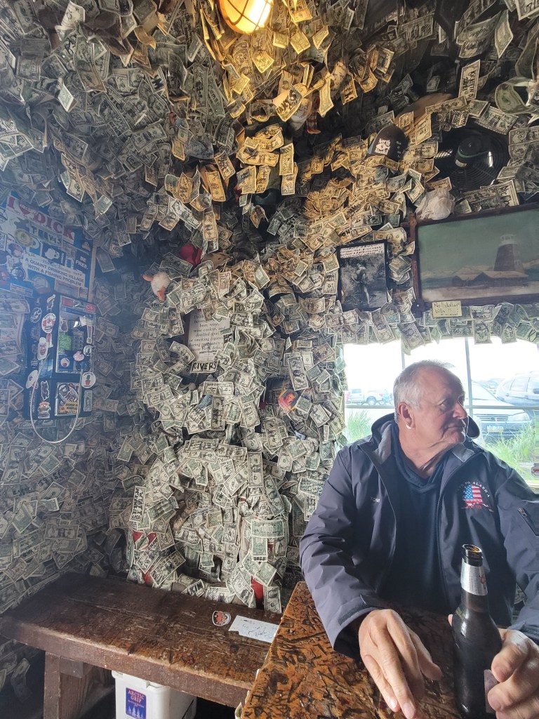 What’s a trip to Homer, Alaska without stopping at the Salty Dawg Saloon? Apparently, it is the place to go, so we stopped in, had a beer, tacked a dollar bill to the wall and enjoyed the quirky atmosphere. Why tack a dollar on the wall? Well, the story goes that years ago a person tacked a dollar bill to the wall stating that his friend would be in later and this was to buy him a drink. The entire place is covered with dollar bills, personally I think the owners collect them yearly as a part of their revenue. So, did we tack a dollar to the wall? Absolutely!