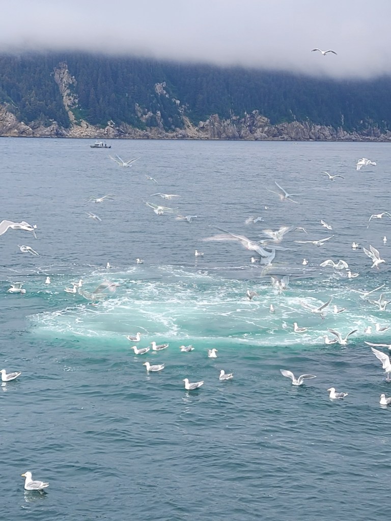 Within a few minutes we saw the blow of about 7 humpback whales who were feeding using a process called bubble net fishing. They would dive deep then while returning to the surface produce a bunch of bubbles, essentially confusing and surrounding the small fish they were going to eat and forcing them to the surface. Then they would all shoot to the surface with mouths open, capturing as many small fish as possible. Although a humpback whale has an enormous mouth its throat is quite small, they eat vast amounts of krill or other small fish but not large ones. Also, since they don’t have teeth, just baleen they can filter out the sea items they are not eating. They are fascinating animals and HUGE! As most of you know I’m not a fan of large things, especially whales. I was OK watching them from a distance, but when they came very close to the boat, my anxiety level rose dramatically! I still was able to get some good photos.