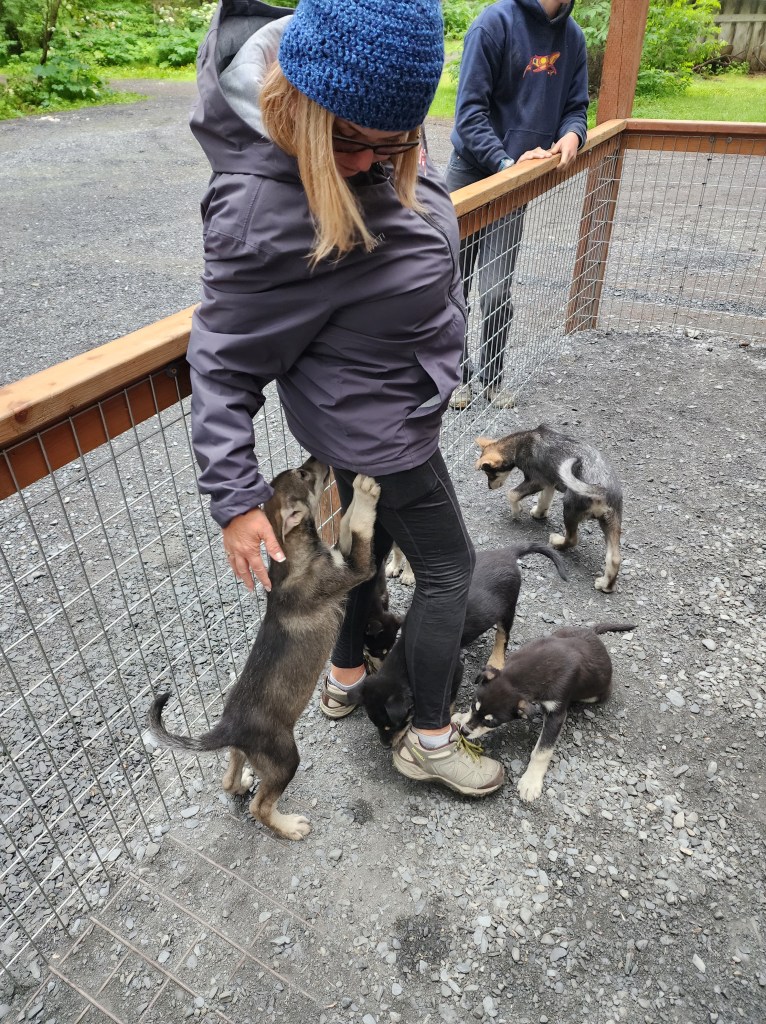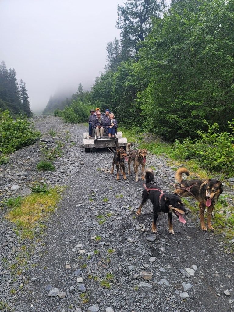 Monday July 31 was our last day in Seward. Although Tom and I were not feeling the best, we both came down with a cold, we had scheduled a dog sled ride at a local dog kennel. The owner of the kennel was Mitch Seavey who is a 5-time Iditarod champion. Apparently retired Iditarod champions, open kennels, train dogs and capitalize on their wins! Unlike Jeff King, Mitch Seavey stays out of the limelight. The young woman who gave the tour, Lara, is an up-and-coming Iditarod musher and is training and learning all she can. The young man who took us on the ride has no interest in running the Iditarod, in his words, “I’m up for a 100-mile race, one you can do in a day, but 8 days in the Alaska wilderness all alone? No thanks!”