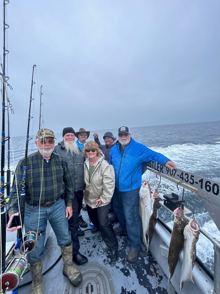 Friday Tom went deep sea fishing for halibut. He successfully caught two and had them cleaned and vacuum sealed. They were not huge, so I got all the meat in our trailer freezer. We’ll bring some of it home to share. Danny and Rick Martinez also caught fish, so we all worked together and cooked up all of it and fed the entire caravan! Yolanda made fish tacos, they grilled a lot of it, some of it we put into foil packs with onion, cilantro, and jalapeno which were then grilled. Yolanda also bacon-wrapped some of the chunks and baked them in the oven – delicious!